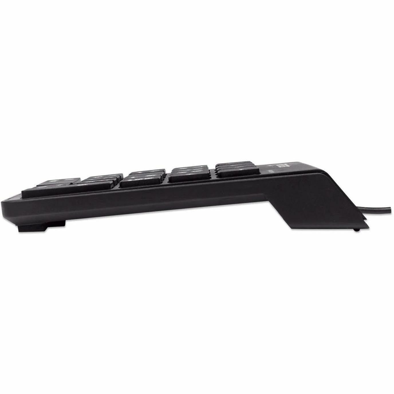 The Manhattan Numeric Wired Keypad makes any notebook computing experience better, especially when you're inputting important numeric data. The full-size 18-key layout and membrane-style key switch technology reduces typing noise, improves response and provides low-profile keystrokes for fast and accurate data entry. A handy backspace key lets you make swift corrections. The asynchronous number-lock function makes it easy to simultaneously input letters from the computer's keyboard and numbers from the keypad. Its USB connection, plug-and-play installation and ultra-slim, lightweight construction make it easy to pack and travel.